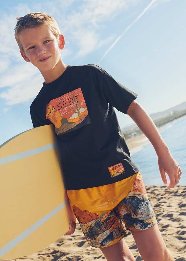 Diseñado con un vibrante estampado de paisajes desérticos en tonos cálidos, este short de baño combina estilo y comodidad para los días de playa y piscina.